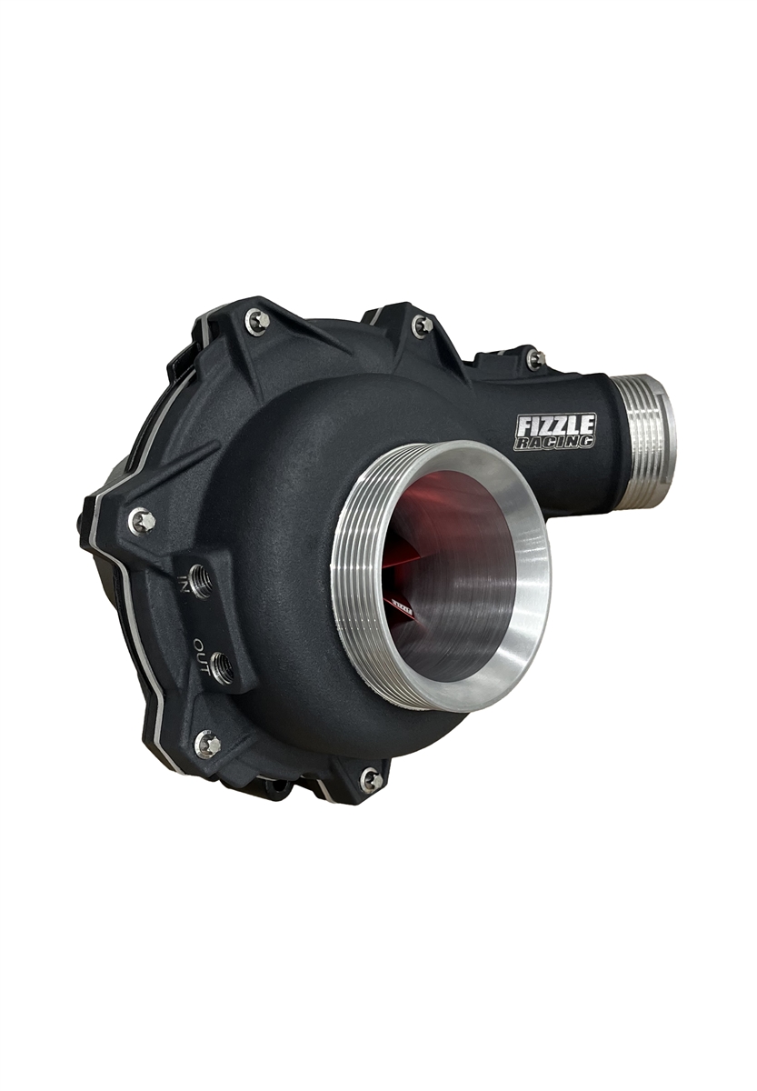 This complete supercharger features a custom designed Fizzle Racing watercooled supercharger front housing to keep temperatures down and maximize reliability at this power level. It also allows for using a larger supercharger impeller size than has ever existed before in history! At a whopping 80mm inlet diameter, this impeller produces arm wrenching acceleration. The front housing is custom ported for extra air flow too!